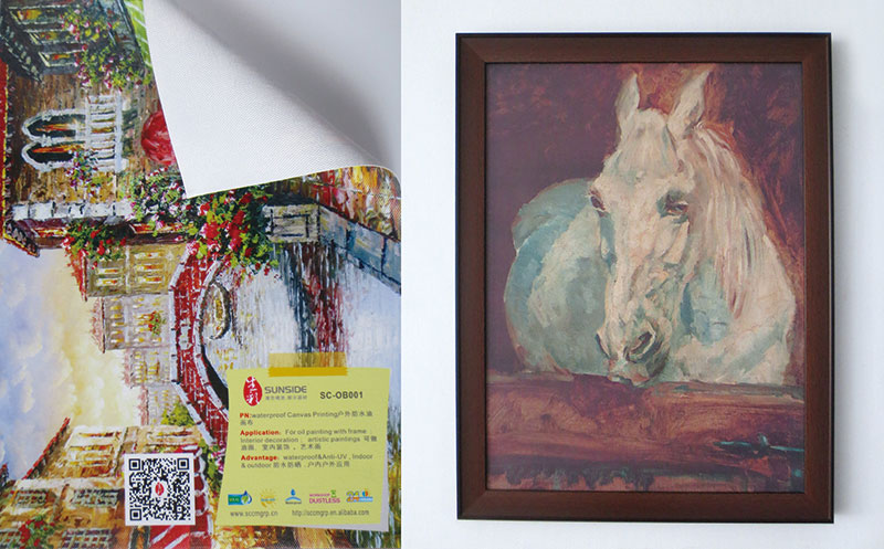 油畫布是按照傳統(tǒng)油畫帆布制成,畫面基色是古典白,普通照片噴繪在油畫布上會出現(xiàn)古典油畫效果,良好的質(zhì)
